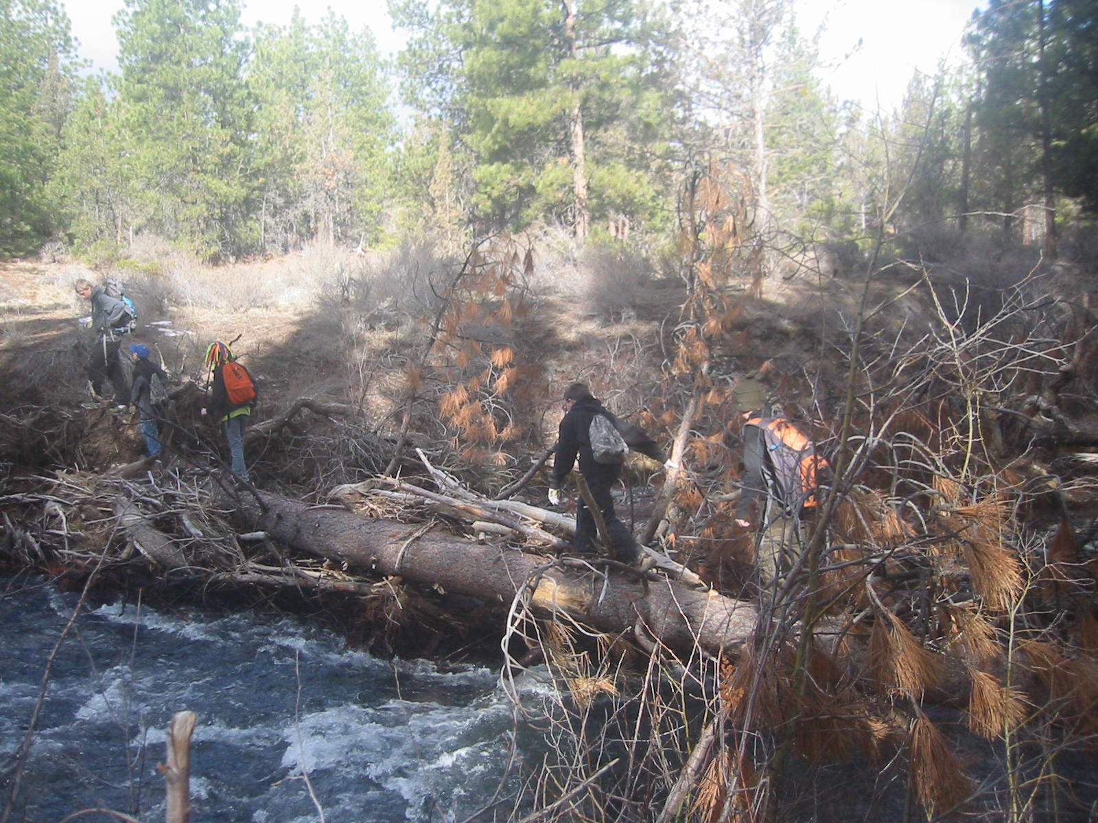 March 9-11, 2012 Whychus Creek Campout. This months campout was close to home as it was the weekend after finals and at the beginning of spring sports season. We had beautiful weather on Friday and Saturday. Saturday morning we planned on hiking an 8 mile loop through the Whychus Creek Wild and Scenic area with a log crossing of the creek at each end. When we got to the upper end, the only one able to negotiate the log crossing was a local Bobcat. We retraced our path and had a great day.