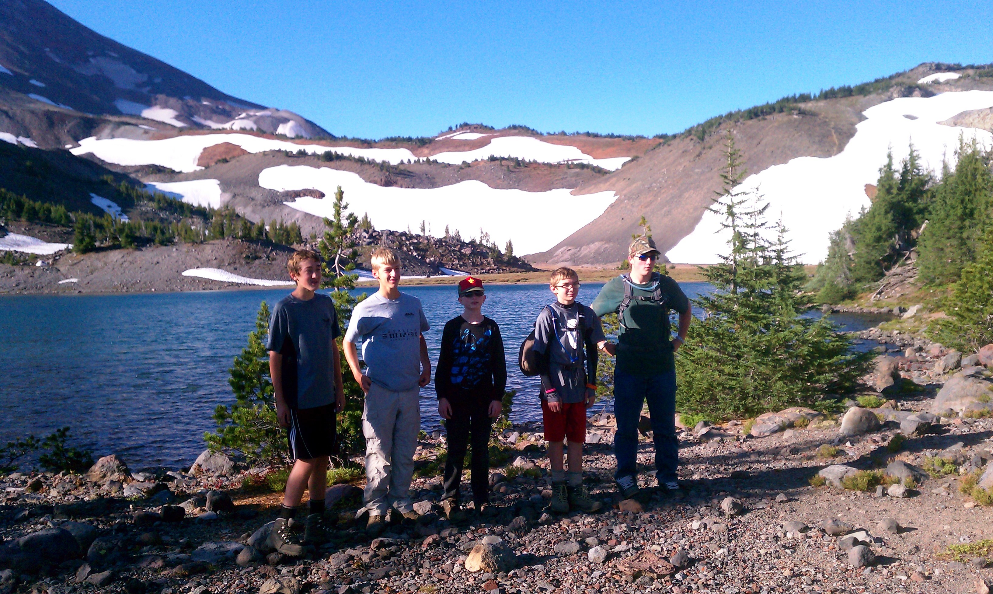 September 23-24, 2011 – Camp Lake & Middle Sister. Friday after school we backpacked into the Three Sisters Wilderness area towards Camp Lake, situated between South and Middle Sister. Saturday morning, we rose, ate and climbed Middle Sister under beautiful skies. The scouts descended through scree slopes and snowfields back to the Chambers Lake area, and hiked back to camp near Whychus Creek where we backpacked out to the trailhead.